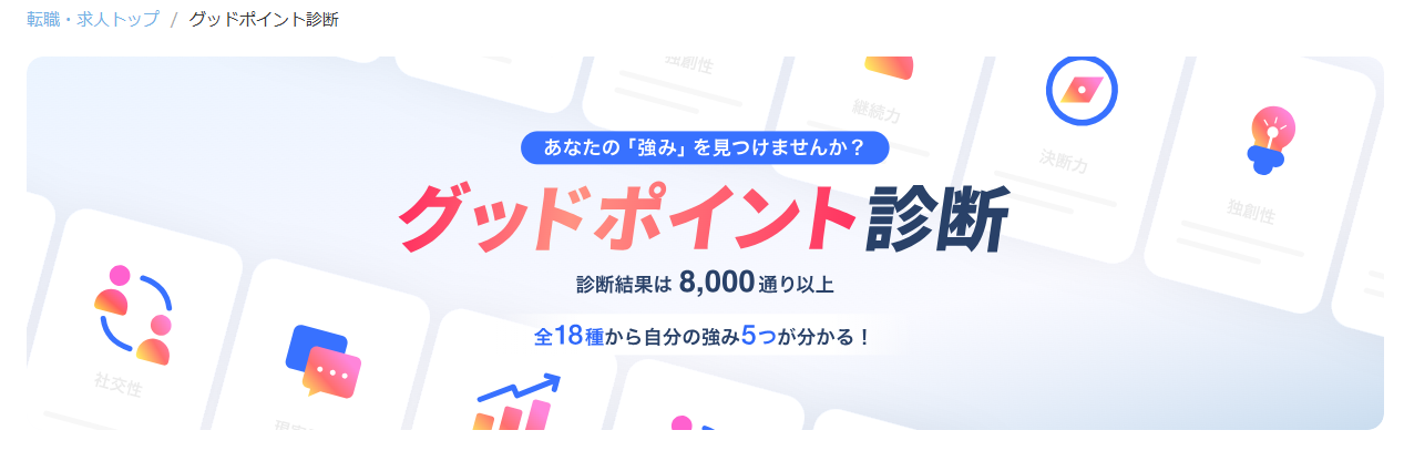 リクナビNEXTを語る上で外せないのが、「グッドポイント診断」の存在です。約30分かけて行う本格的な自己分析ツールなのですが、これが本当に役に立ちます。