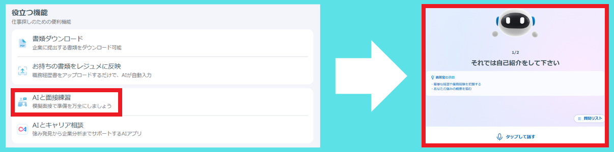 AIで「職務要約」を自動生成できる機能以外にも、「AIと面談練習」「AIとキャリア面談」できる機能が備わっています。